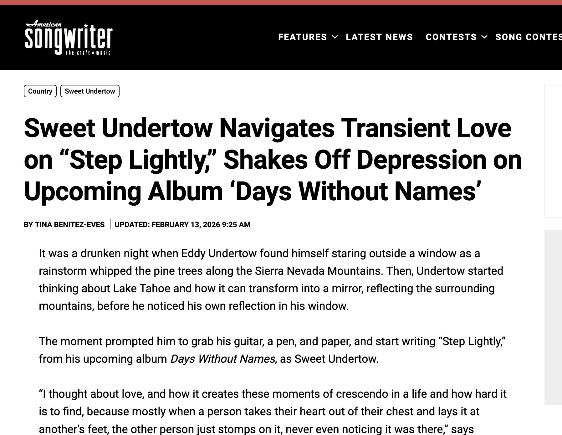 The moment prompted him to grab his guitar, a pen, and paper, and start writing “Step Lightly,” from his upcoming album Days Without Names, as Sweet Undertow.